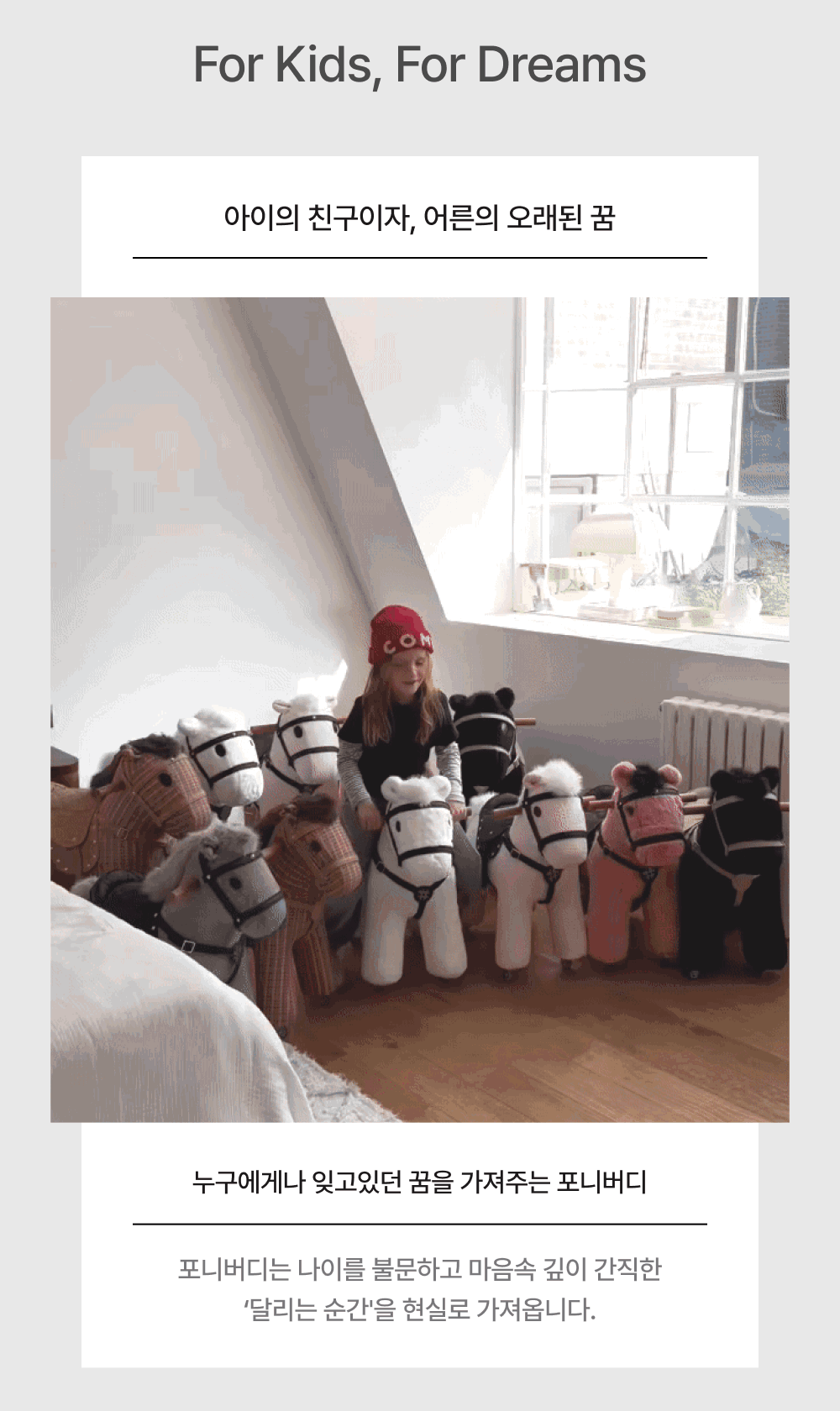 포니버디는 상상과 일상 속에서 함께 달리는 반려마 인형입니다.